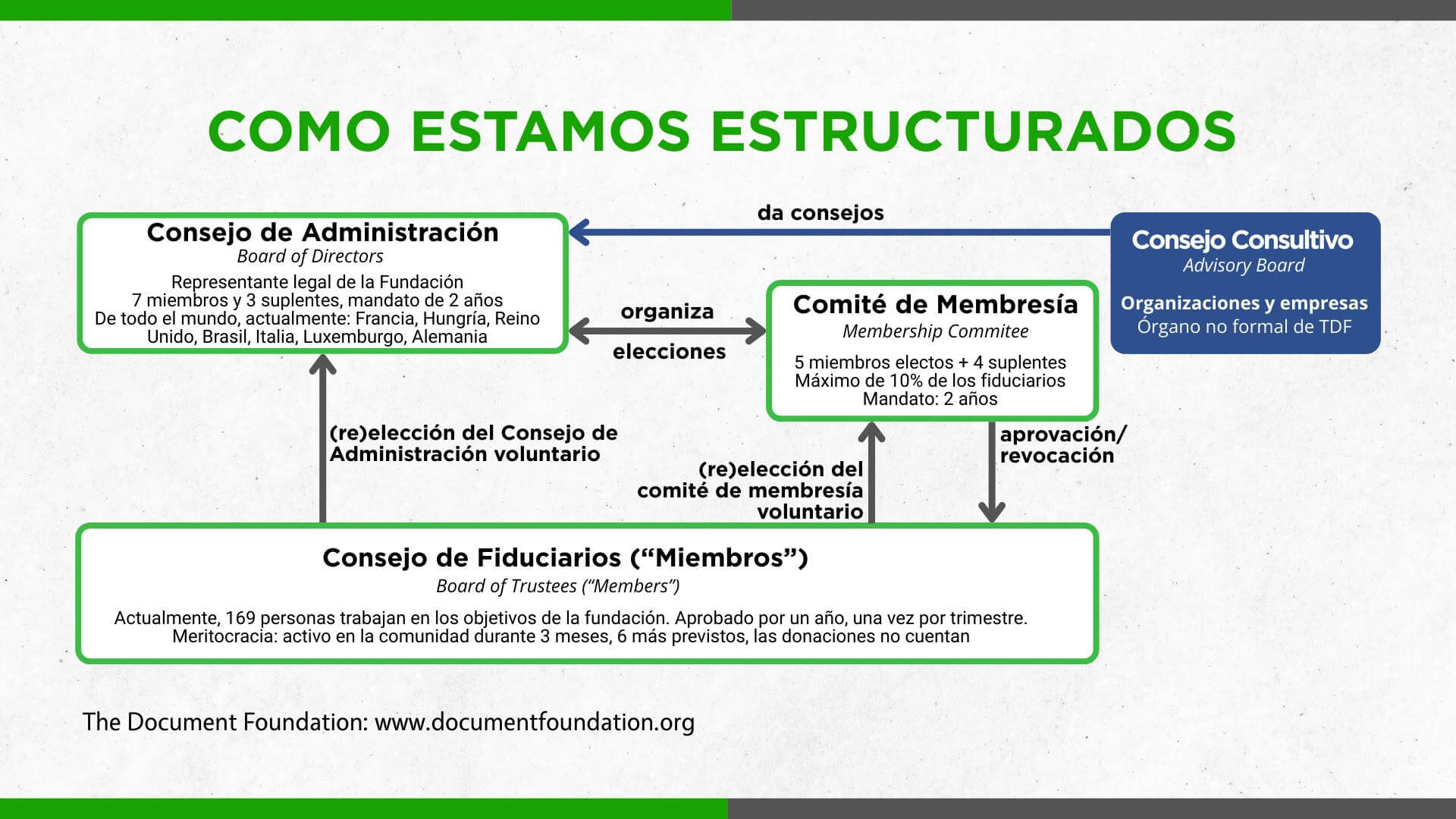 The Document Foundation (TDF) es la entidad sin fines de lucro que respalda el proyecto LibreOffice. Recauda donaciones de los usuarios y cuenta con un pequeño equipo que da soporte y coordina a la comunidad mundial que desarrolla el software. TDF cuenta con varios órganos, entre los que se incluyen la Junta Directiva, el Comité de Membresía y el Consejo de Fideicomisarios:
