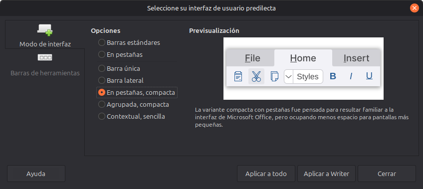LibreOffice ofrece varios modos de interfaz. El usuario puede elegir entre la vista clásica con menús y barras de herramientas, la interfaz por pestañas (similar a la cinta), versiones compactas, barra agrupada o un diseño centrado en la barra lateral.